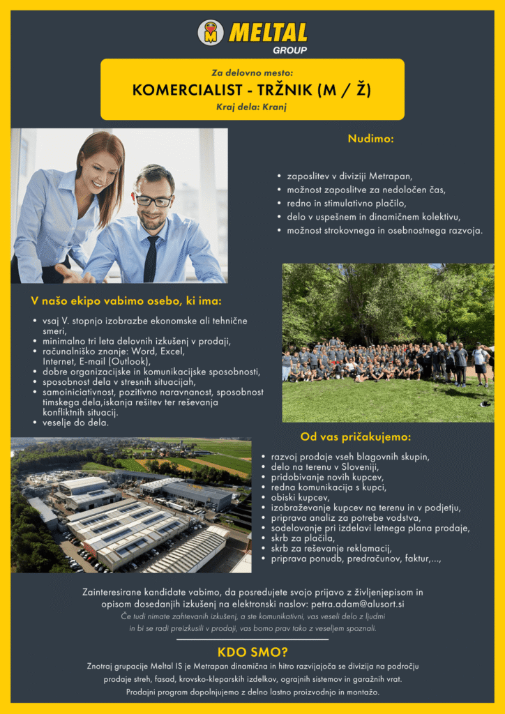 Zainteresirane kandidate vabimo, da posredujejo svojo prijavo z življenjepisom in opisom dosedanjih izkušenj na elektronski naslov: petra.adam@alusort.si